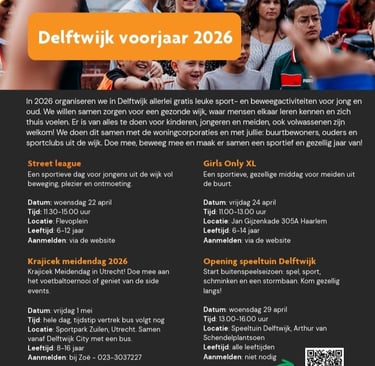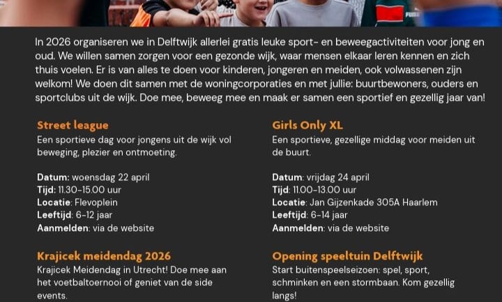 Goed nieuws voor bewoners van Delftwijk! In het voorjaar van 2026 worden er gratis sport- en beweegactiviteiten georganiseerd voor jong en oud.