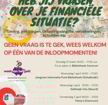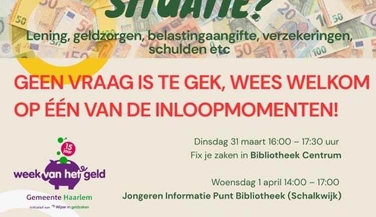 Je staat er niet alleen voor. Tijdens de Week van het Geld in Haarlem worden er op verschillende locaties in de stad gratis inloopmomenten georganiseerd. Je kunt gewoon binnenlopen — geen vraag is te gek.