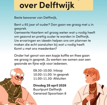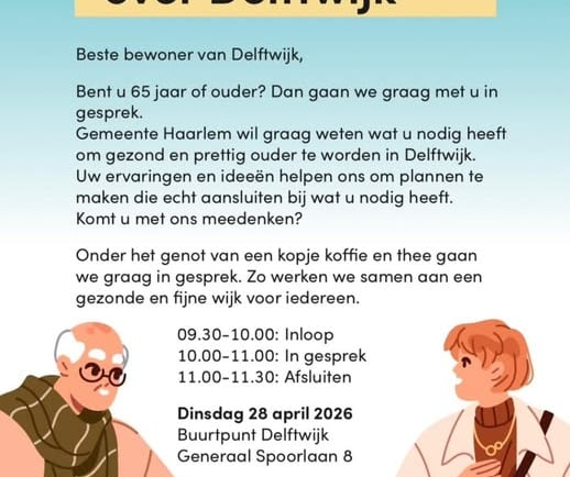 De gemeente Haarlem nodigt bewoners van 65 jaar en ouder in Delftwijk uit voor een waardevolle bijeenkomst. Tijdens deze ochtend staat één vraag centraal: wat heeft u nodig om prettig en gezond ouder te worden in uw eigen wijk?