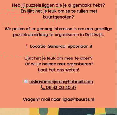 Er wordt gekeken of er genoeg interesse is voor een puzzelruilmiddag in Delftwijk. Bewoners kunnen puzzels die ze al gemaakt hebben ruilen met buurtgenoten.