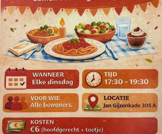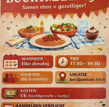 Voor veel bewoners is dit hét moment om even de deur uit te gaan, nieuwe mensen te leren kennen en bij te praten met buurtgenoten. Of u nu alleen komt of samen, iedereen is welkom aan tafel.
